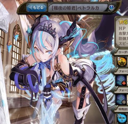 | お嬢様のテーブルマナー 味方全体の攻撃力を△△%アップ。 | お嬢様の言葉使い 味方全体の攻撃力を△△%アップ。 | プリッツヘイル 水属性の単体攻撃。 防御力を無視してダメージを与える。 | ブリザードラッシュ 水属性の△△%攻撃を6~8回連続攻撃。 中確率石化。HP半分以上なら威力1.5倍。 | ||||||||||||||||