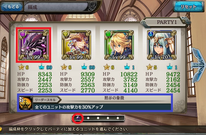 - 第1パーティの、リーダー(左端)に配置されているユニットが、