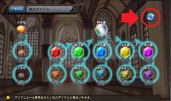 - 強化に必要なアイテム在庫の確認は、進化アイテムの裏にある(下図参照)