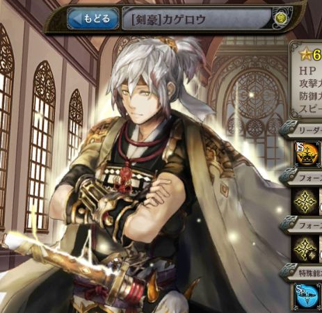 | 抜刀・花鳥風月 光属性の△△%全体攻撃。超高確率麻痺。 スキル後、自身に1ターン麻痺を付与。 | 奥義・明鏡止水 光属性の△△%全体攻撃。超高確率麻痺。 スキル後、自身に1ターン麻痺を付与。 | 秘奥義・落花流水 光属性の△△%全体攻撃。超高確率麻痺。 スキル後、自身に1ターン麻痺を付与。 |