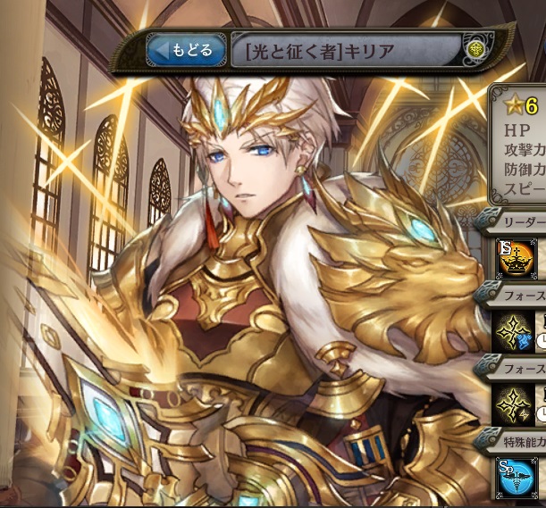 | 天空旋光斬 敵単体に光属性の△△%ダメージの防御無視5連撃。クエスト開始時、CTが3。 | 覇天翔光斬 敵単体に光属性の△△%ダメージの防御無視5連撃。クエスト開始時、CTが3。 | 烈破猛光斬 敵単体に光属性の△△%ダメージの5連撃。高確率麻痺。クエスト開始時、CTが3。 |