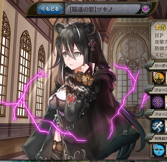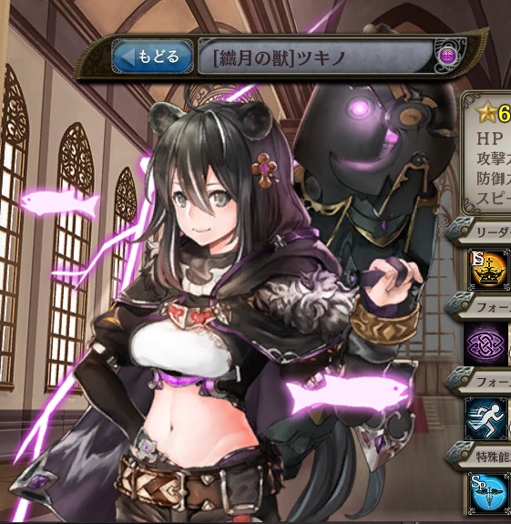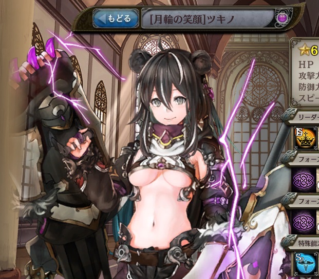 | 月の輪の祈り 味方全体のスピード1ターン99%ダウンし、味方全体にクイックを1ターン付与する。1ターン後に発動。 (CT:△△ターン) | 月に吠える獣 味方全体のスピード1ターン99%ダウンし、味方全体にクイックを1ターン付与する。1ターン後に発動。 (CT:△△ターン) | 紫電の咆哮 自身のスピード3ターン80%ダウンし、敵単体に闇属性の△△%の防御無視9連撃。 |