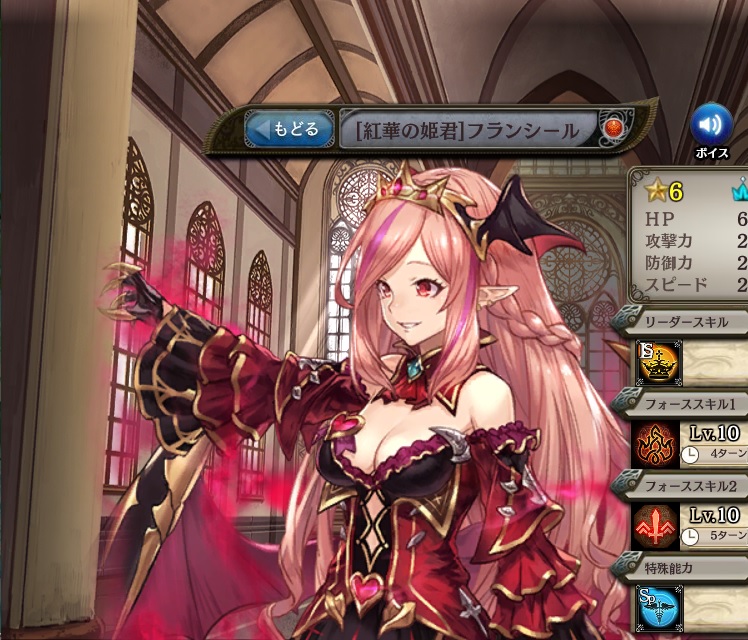 | クィーンズディナー 火属性の全体攻撃。 相手の防御力を無視してダメージを与える。 | デモンズジルバ 火属性の全体攻撃。 相手の防御力を無視してダメージを与える。 | ブラッドレッドエンド 火属性の全体攻撃。 相手の防御力を無視してダメージを与える。 | |||||||||||||||||||||||||||