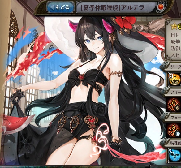 | 常夏の激務 HP99%消費し、味方全体にクイックを1ターン付与する。1ターン後に発動。 (CT:△△ターン) | メイドインバカンス HP99%消費し、味方全体にクイックを1ターン付与する。1ターン後に発動。 (CT:△△ターン) | 過ぎ去りし空蝉 味方単体のHP90%消費し、火属性の△△%全体攻撃。超高確率麻痺。 |