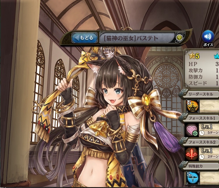 | アイドルの気まぐれ HP25%を消費し発動。味方全体の攻撃力を3ターンの間△△%アップ。 | アイドルの愛嬌 HP25%を消費し発動。味方全体の攻撃力を3ターンの間△△%アップ。 | アイドルのちょい本気 HP25%を消費し、光属性の△△%の12~16回連続攻撃。超高確率で石化付与。 |