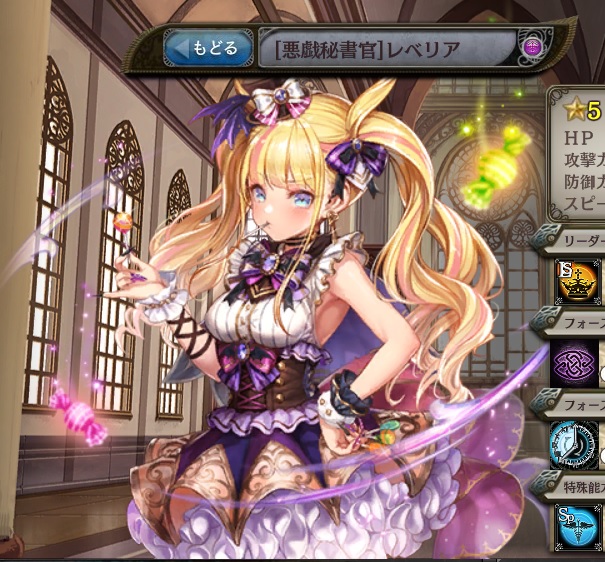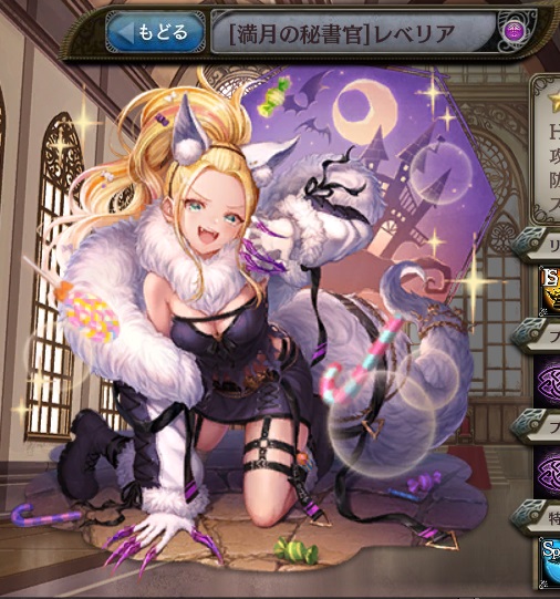 | 悪戯秘書官の洗礼 味方単体のHP25%消費し、味方単体のスキルクールタイムを△△ターン短縮する | 吸血秘書官のイタズラ 味方単体のHP25%消費し、味方単体のスキルクールタイムを△△ターン短縮する | 狼秘書官のオモテナシ 闇属性の△△%攻撃を16~20回連続攻撃。防御力無視。HP最大なら威力2.0倍。 |
