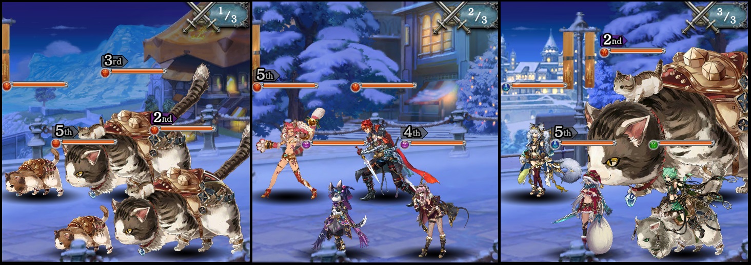 | アーリーキャッツを求めて 幻獣級 | 50 | 1280 | ★5[幻獣猫]ビッグマム ★5[水]キングキューコン | 大帝粒 魔力の宝石(カリスマボーナス) 黙示の腕輪 剛力のイヤリング 守護の指輪 スカーレットペンダント 生命の腕輪 防護の指輪? 疾風のペンダント 大地のネックレス |