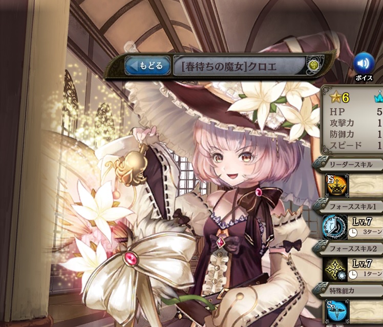 | 早咲きの小花 味方単体のスキルクールタイムを△△ターン短縮する。 | 早咲きの春花 味方単体のスキルクールタイムを△△ターン短縮する。 | 爛漫の春花 光属性の△△%単体攻撃。ダメージ後、ステータス上昇効果を打ち消す。 |