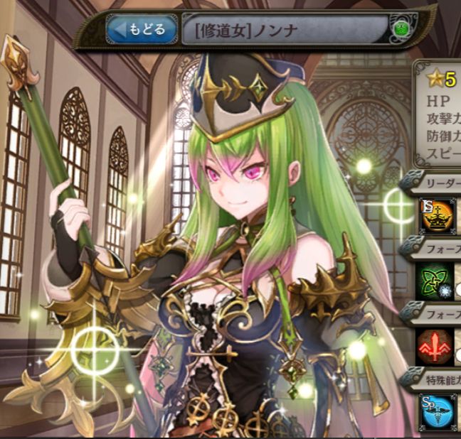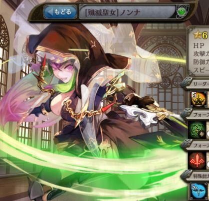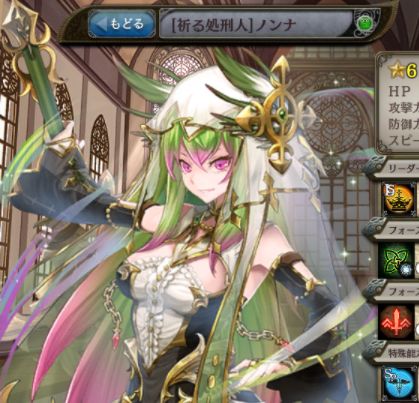 | 備考 おすすめ育成法 | 特徴 | 2回行動を持ち、CT1とCT2でスキルを使っていける回転率のいいユニット。 進化契約共通のFS2は味方単体のHP50%を消費することで、1ターンギガバフを付与することができる。 一見すると代償はマイナス効果のように思えるが、 自傷なし起死回生持ちユニットと組ませれば、HPの調整がしやすくなるのでうまく使えば便利である。 ノンナはガチャ以外で唯一入手可能なHP代償持ちユニット(全HP代償のファヴランデレは除く)なので、 HP調整をしたい人は交換しておくのも悪くないと思う。 |