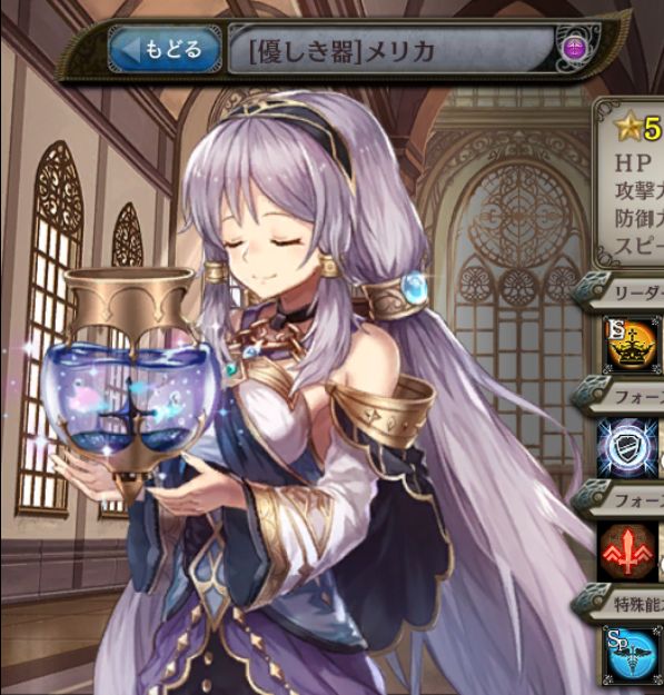 | 祈りの水瓶 HP15%消費し、味方全体の攻撃力を△△%アップ。 | 恵みの水瓶 HP15%消費し、味方全体の攻撃力を△△%アップ。 | 清浄の水瓶 闇属性の170%単体攻撃。 ダメージ後、ステータス上昇効果を打ち消す。 |