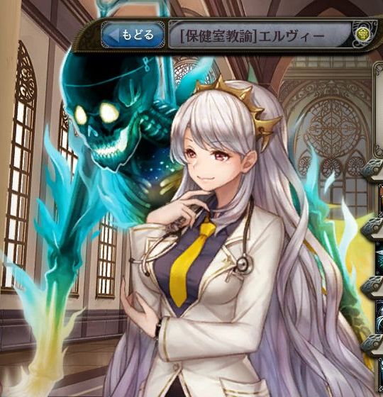 | 保健室の掟 戦闘開始から1ターンの間ダメージ無効 | 白衣の掟 戦闘開始から1ターンの間ダメージ無効 | 先生の囁き 戦闘開始から1ターンの間ダメージ無効 |