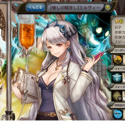 | 授業をはじめるわ 味方全体が戦闘不能になった時、 戦闘不能から復帰しHP△△%回復。 1ターン後に発動 | 傷を見せて頂戴ね 味方全体が戦闘不能になった時、 戦闘不能から復帰しHP△△%回復。 1ターン後に発動 | 先生からのご褒美よ 味方全体が戦闘不能になった時、 戦闘不能から復帰しHP△△%回復。 1ターン後に発動 |