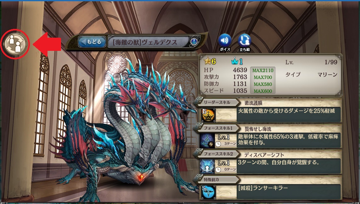 | 忌避すべき災厄 敵単体に水属性【△△%】の3連撃。低確率で麻痺効果を付与。 | 畏怖せし海流 敵単体に水属性【△△%】の3連撃。低確率で麻痺効果を付与。 | 覆い尽くす高波 敵単体に水属性【△△%】の6連撃。低確率で麻痺効果を付与。 |