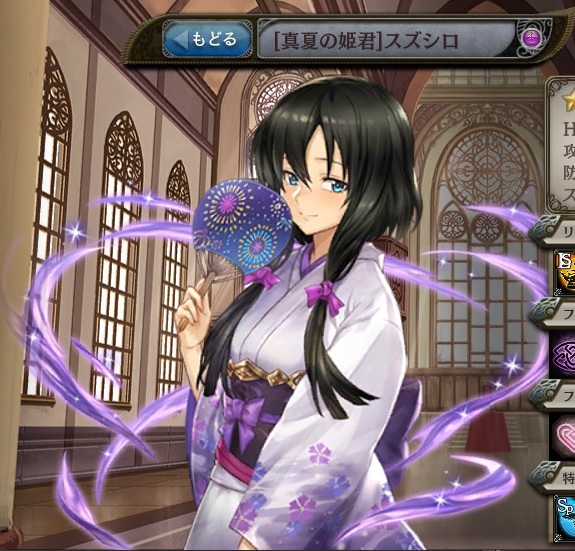 | 初夏の風 味方単体のHPを全回復。スキル後、自身の防御力50%ダウン。 | 夏夜の涼風 味方単体のHPを全回復。スキル後、自身の防御力50%ダウン。 | 浜撫でる夏風 味方単体のHP25%消費し、 味方単体のスキルクールタイムを△△ターン短縮する。 |