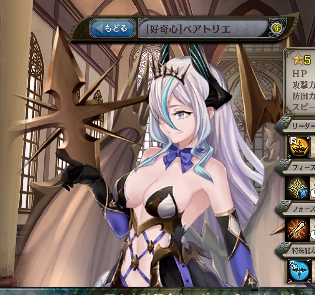 | 無邪気な囁き 味方単体のクリティカル率を1ターンのみ△△%アップ。 | 女神の蠱惑 味方単体のクリティカル率を1ターンのみ△△%アップ。 | 女王の魅惑 味方単体の攻撃力を1ターンのみ△△%アップ。 |