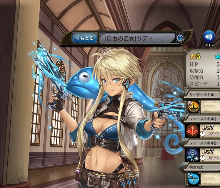 | 自由の乙女の鼓舞 味方全体の攻撃力を△△%アップ。 | 風裂く蒼弾の発破 味方全体の攻撃力を△△%アップ。 | 掃審美の女神の加護 味方単体のスキルクールタイムを△△ターン短縮する |