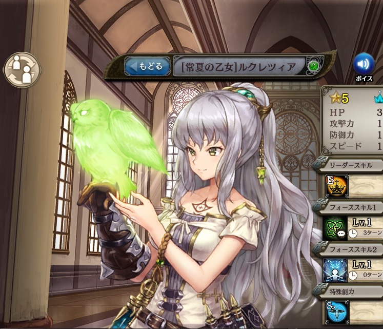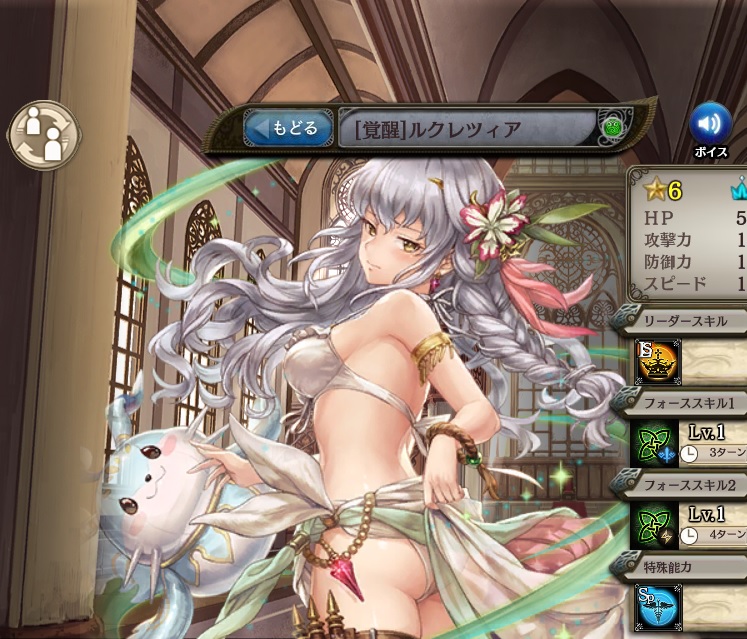 | 備考 おすすめ育成法 | 特徴 | あのルクレツィアが水着姿で登場。そのスタイルと言い、胸も中々な物である。(是非サンオイルを塗りたい物だ) 覚醒スキルを備えているので、通常の運用とはやや異なる。 |