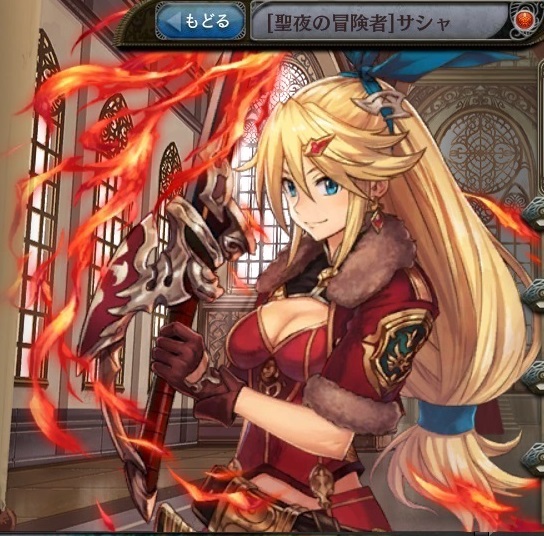 | 備考 おすすめ育成法 | 特徴 | 火属性随一の高火力アタッカー。通常サシャ?と比べてキラーが一つ増え、雪だるま化も付与できるようになった。 |
