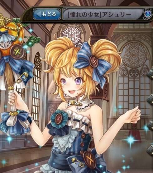 | ラグリボン 味方単体のスキルクールタイムを【△△ターン】短縮する。 | ハンドメイドドレス 味方単体のスキルクールタイムを【△△ターン】短縮する。 | グラスヒール 水属性の【△△%】全体攻撃。 ダメージ後、ステータス上昇効果を打ち消す。 |